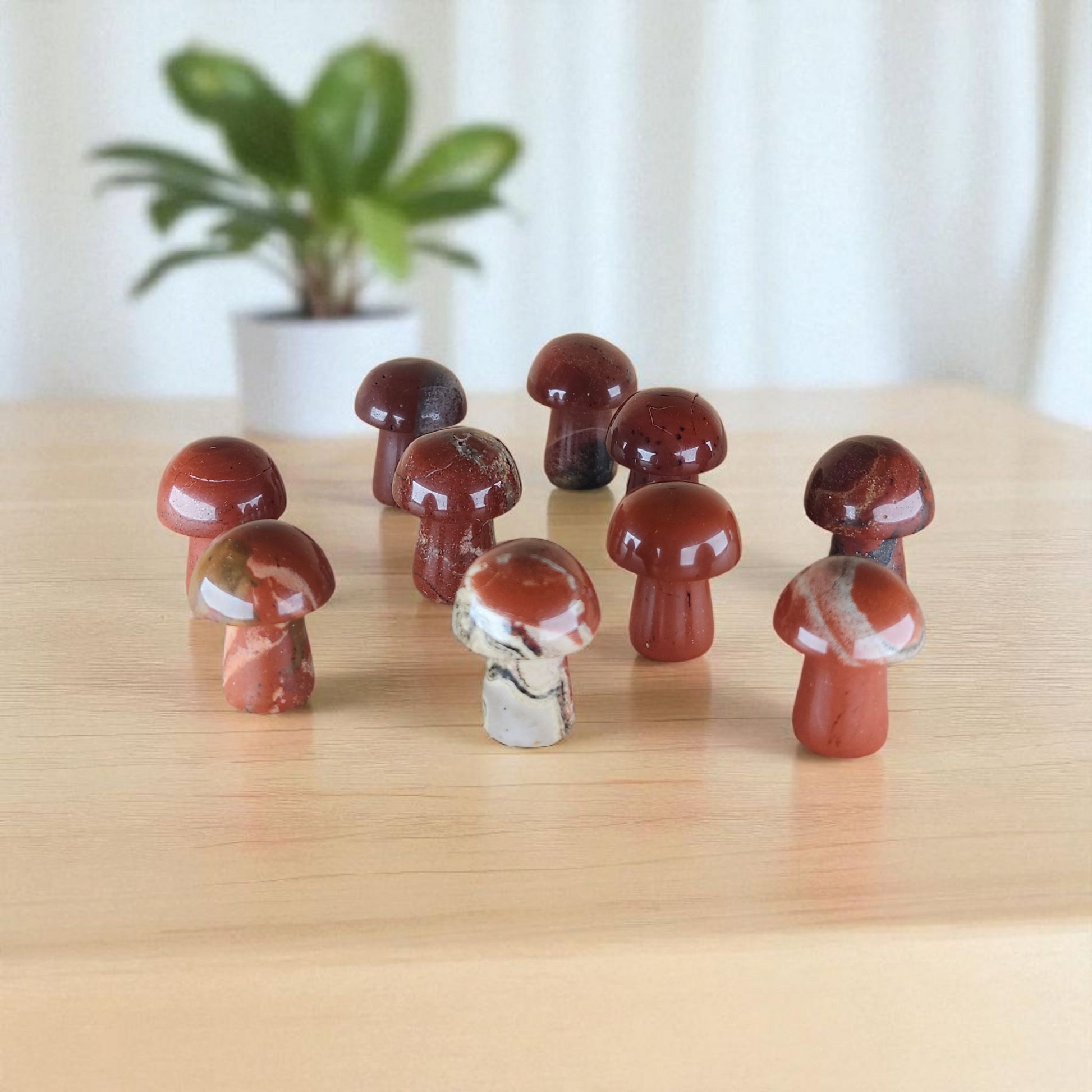 Enhance your crystal collection with our Red Jasper Mushroom. This .75" piece features the vibrant red colors of jasper, known for its grounding and healing properties. Add it to your meditation or feng shui practice for increased energy and balance.